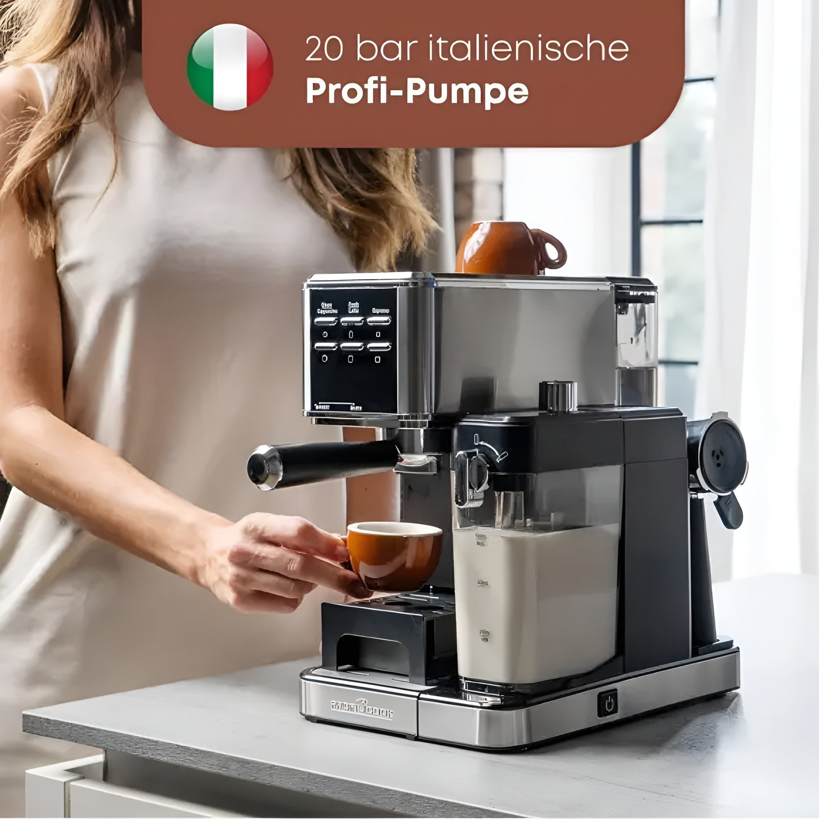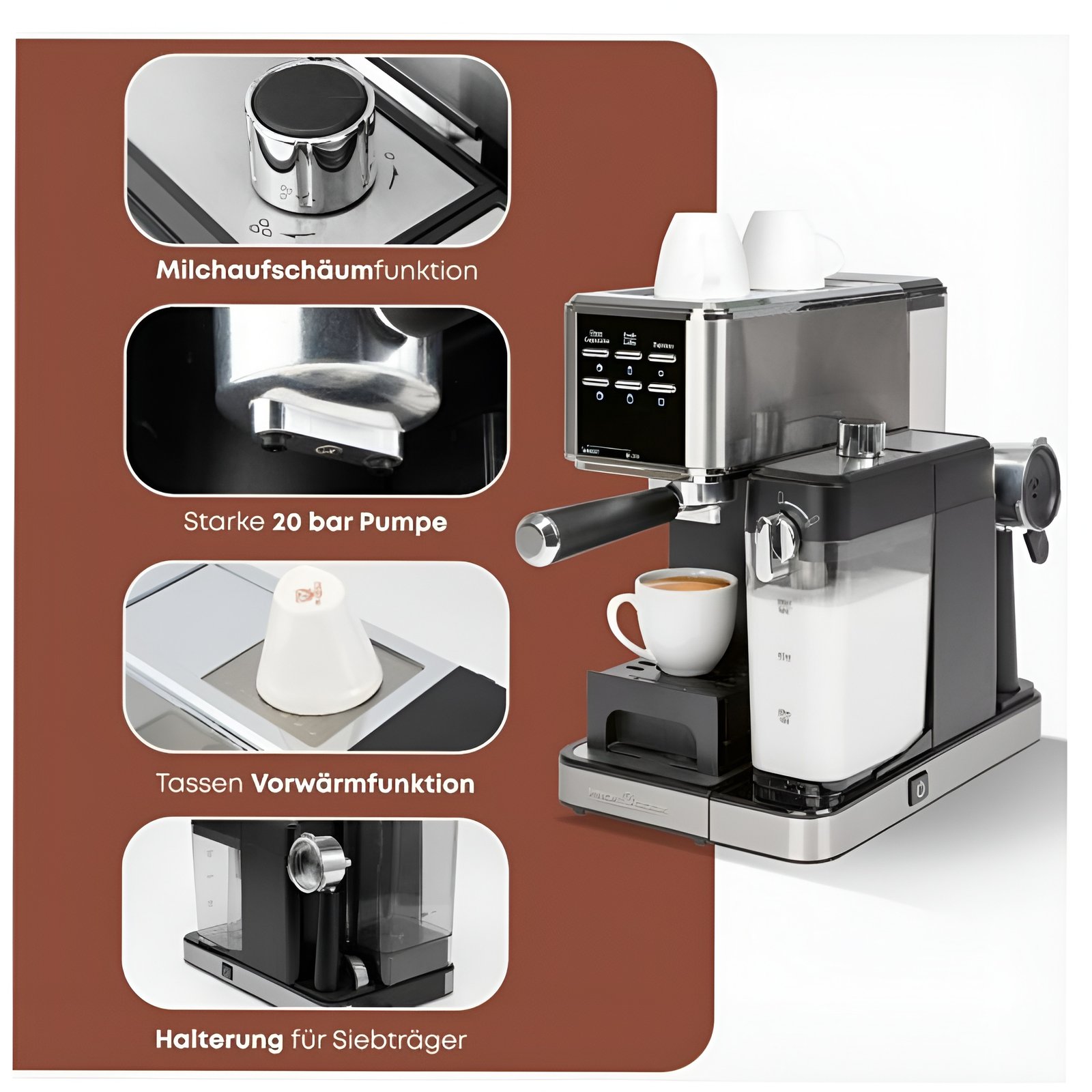 20 bars – La machine à expresso de ProfiCook est équipée d’une pompe à expresso professionnelle italienne qui génère une pression allant jusqu’à 20 bars – pour un expresso aromatique avec une crème parfaite.