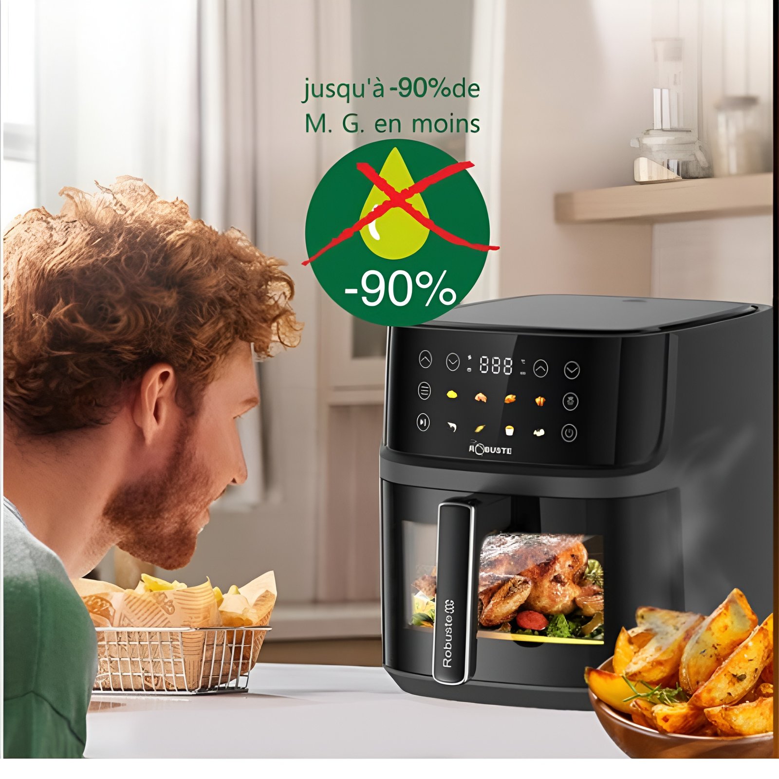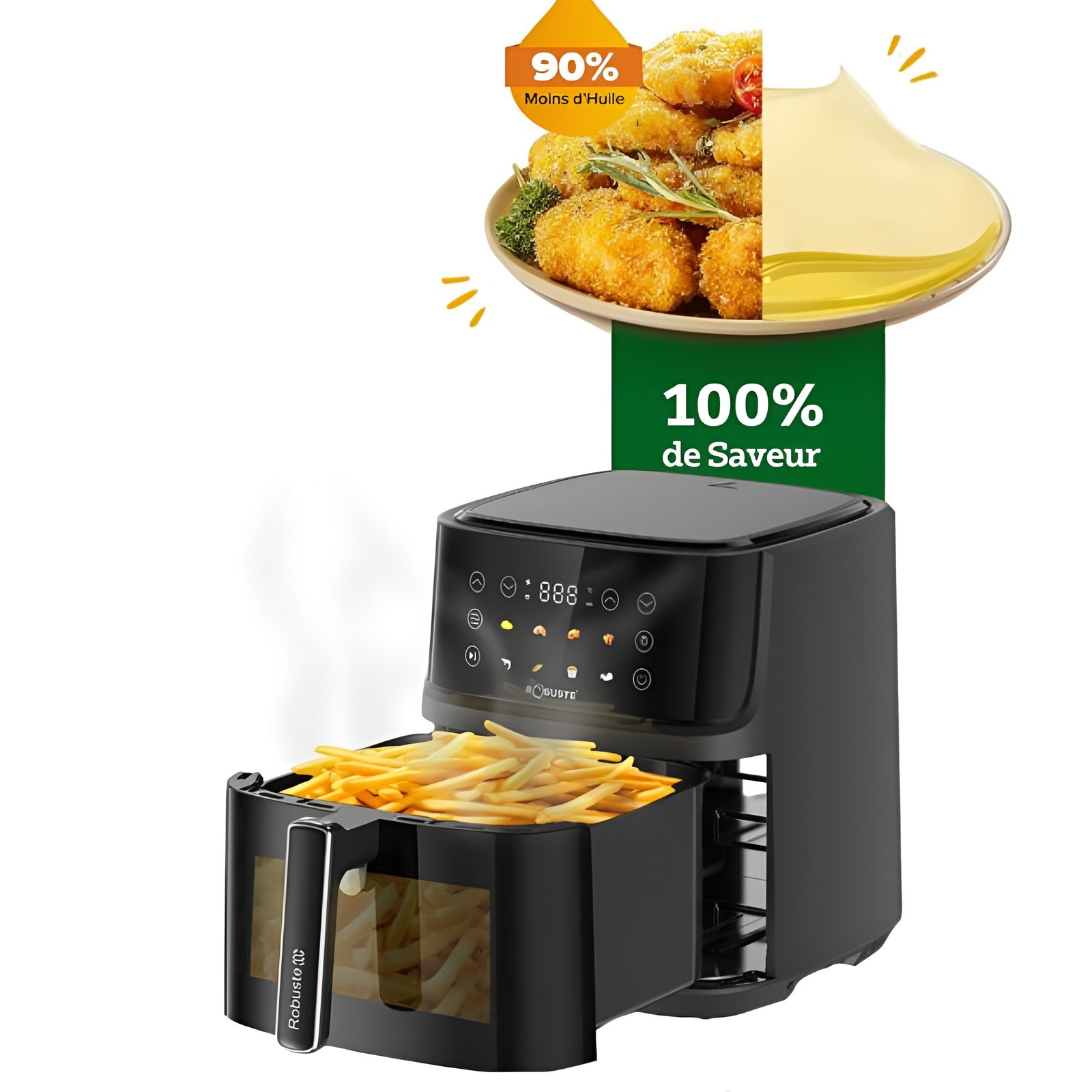 - Cuisson sans (ou avec très peu) d’huile pour des plats sains jusqu’à 80 % moins de matières grasses